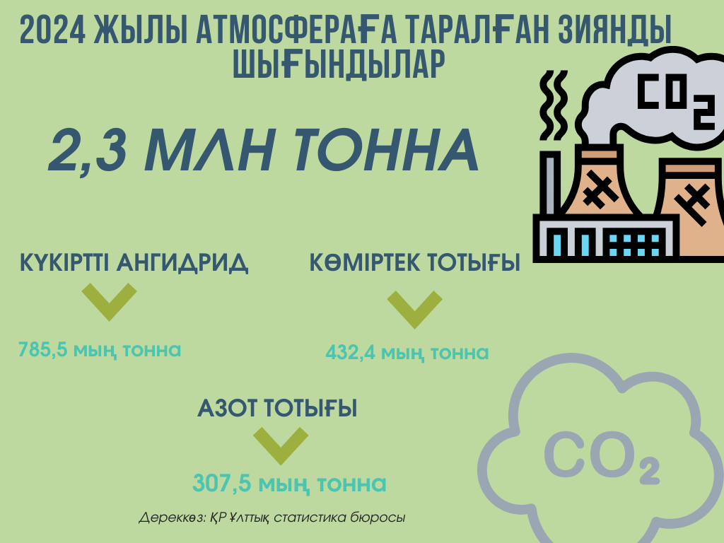 По данным Бюро национальной статистики РК, в 2024 году объём вредных выбросов в атмосферу в Казахстане составил 2,3 млн тонн. В их числе: диоксид серы – 785,5 тыс. тонн, оксид углерода – 432,4 тыс. тонн, оксиды азота – 307,5 тыс. тонн. Эти показатели значительно выше, чем у других государств Центральной Азии и свидетельствуют об ухудшении экологической ситуации в стране.